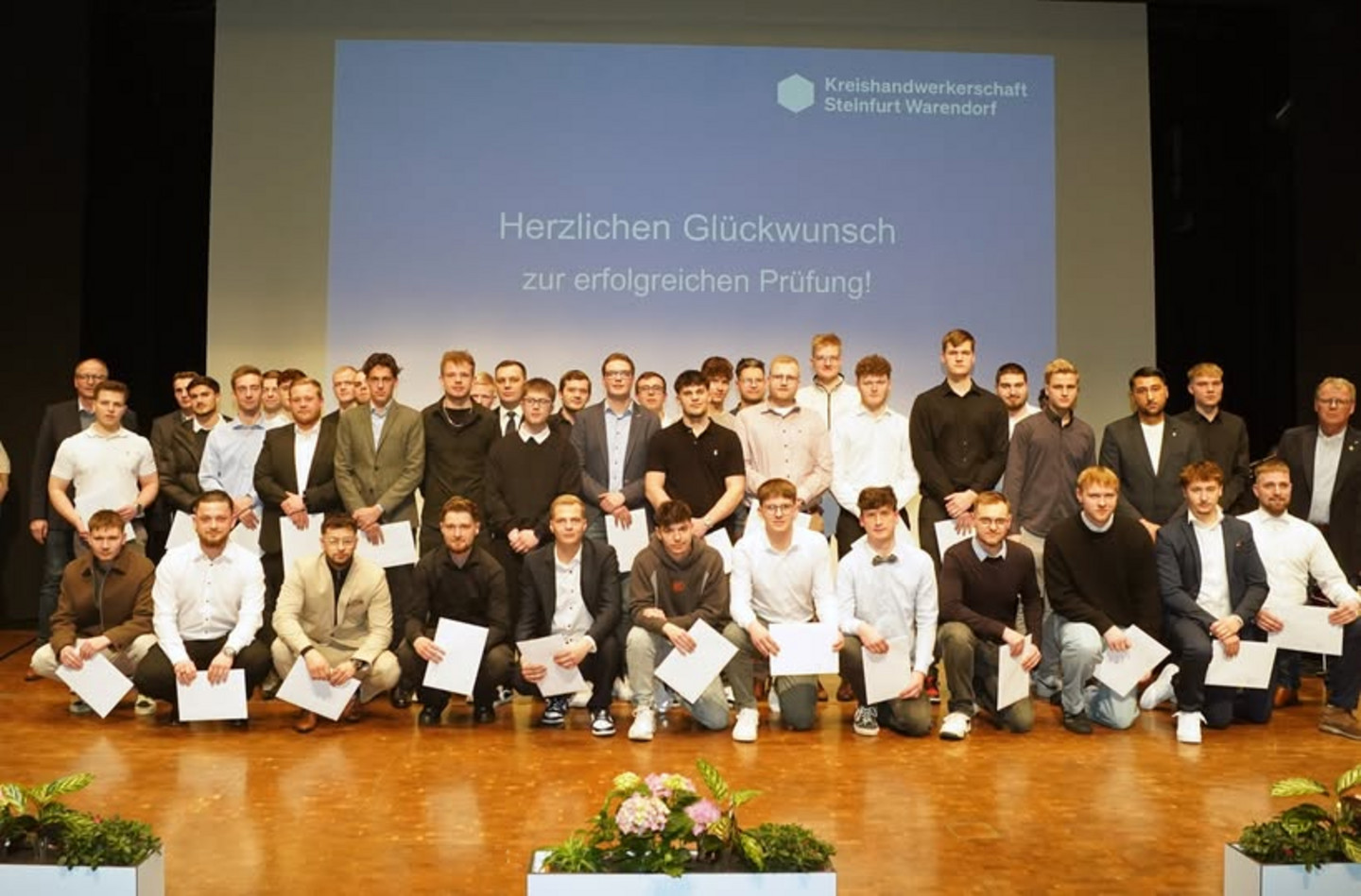 Im Rahmen der Lossprechungsfeier am 29. Januar 2026 in der Stadthalle Rheine erhielten nach ihrer erfolgreichen Prüfung die neuen Gesellinnen und Gesellen im Metallbereich ihre Gesellenbriefe und Prüfungszeugnisse aus den Händen von Obermeister Georg Hagemann und stellvertretenden Obermeister Carsten Dreyer von der Metall-Innung Steinfurt. Herzlichen Glückwunsch!